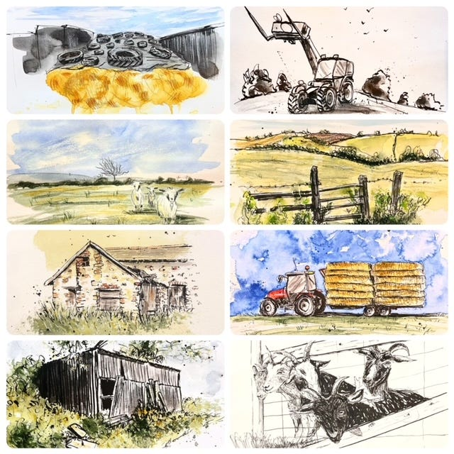 For the entire month of November, my sister https://www.emmacavill.com/ and I ran a farm related challenge over on our Instagram pages. The aim of the challenge was to keep up a daily sketching habit, which is all too easy to drop when life gets busy. It was off the back of #boatober (an October boat sketching challenge on insta) so we have actually done 61 days straight. Every day we would take it in turns to post a photo of one of our farms, we called it #farmvember2023 – The four main categories were: